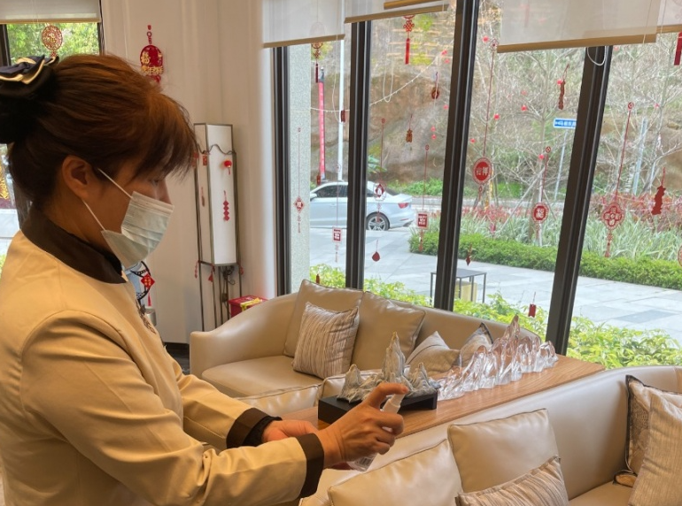 在售的冠城大通华玺项目,所有员工每日按时测量体温,工作期间全程佩戴口罩。为每位到访客户提供一对一的接待服务。同时,华南区域公司定时对售楼部公共区域、卫生间、会议室等区域进行全方位消毒,确保无遗漏,给每位员工及客户提供一个安全、放松、舒适的环境!
